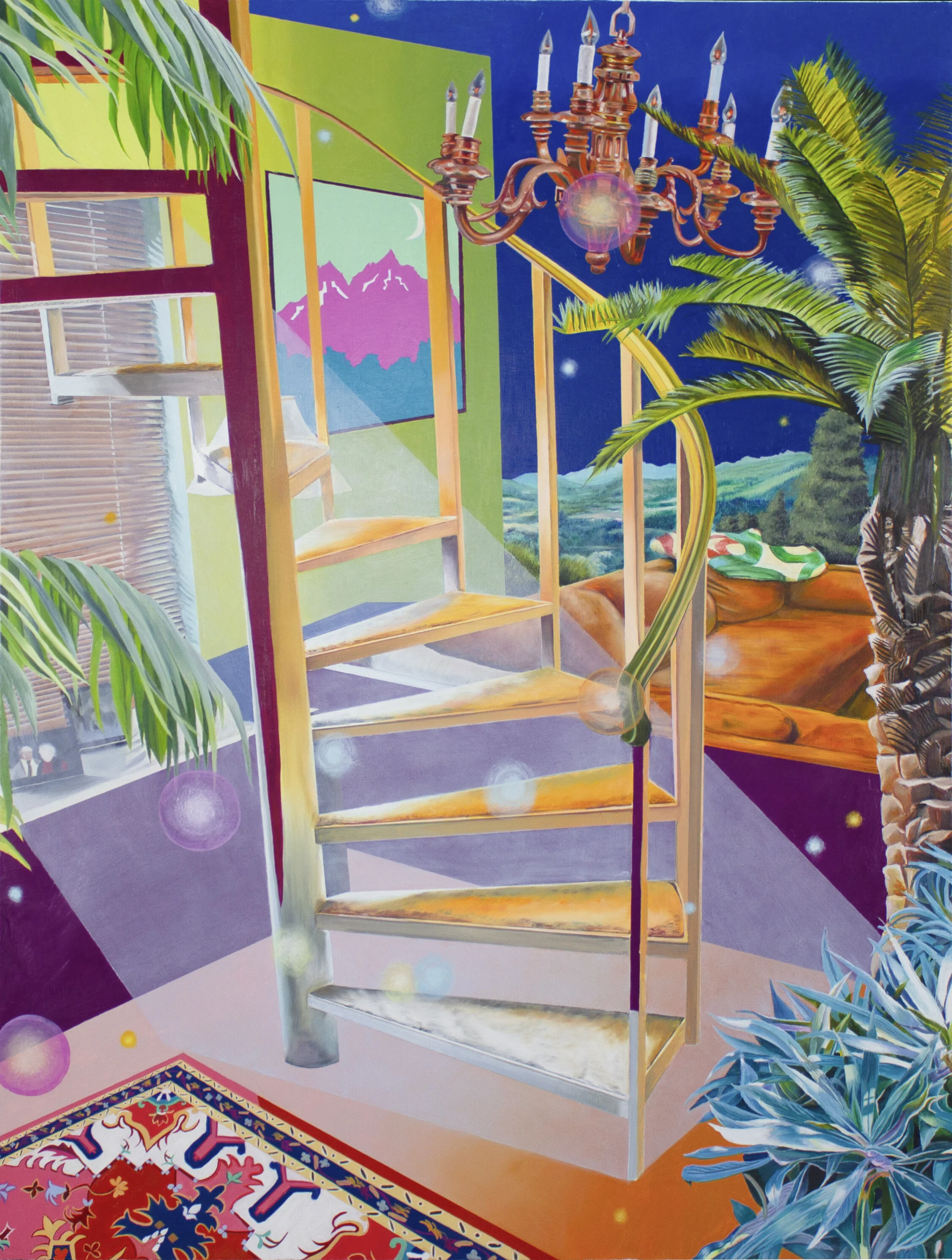 In “Time I Forgot” I wanted to specifically deal with memory. The staircase and interior depicted is based on my grandparents old condo in southern Indiana. I have always been attracted to staircases, they are really elegant and mysterious everyday examples of liminal spaces. I used to play on these a lot as a kid and in this one I wanted to juxtapose the imaginary worlds I visited as a child with the other world my late grandparents must be in now